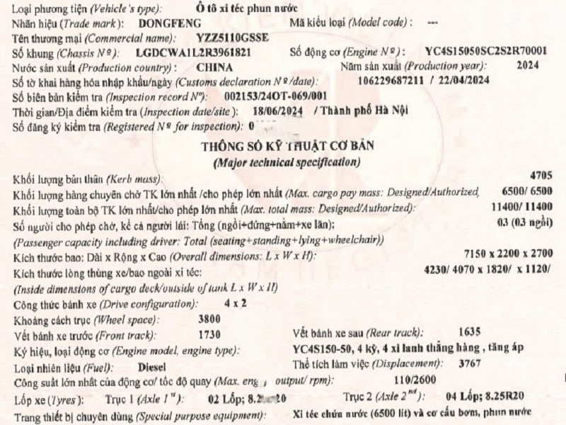 THÔNG SỐ CHI TIẾT XE XI TÉC PHUN NƯỚC RỬA ĐƯỜNG TƯỚI CÂY 6.5 KHỐI DONGFENG NHẬP KHẨU