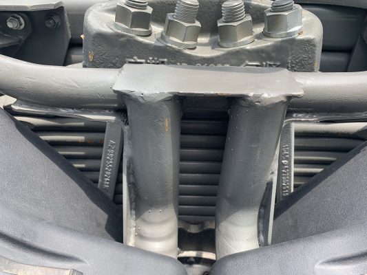 Hệ thống treo trước: 3 lá nhíp, dạng bán elip kết hợp với giảm chấn thủy lực và bộ cân bằng.